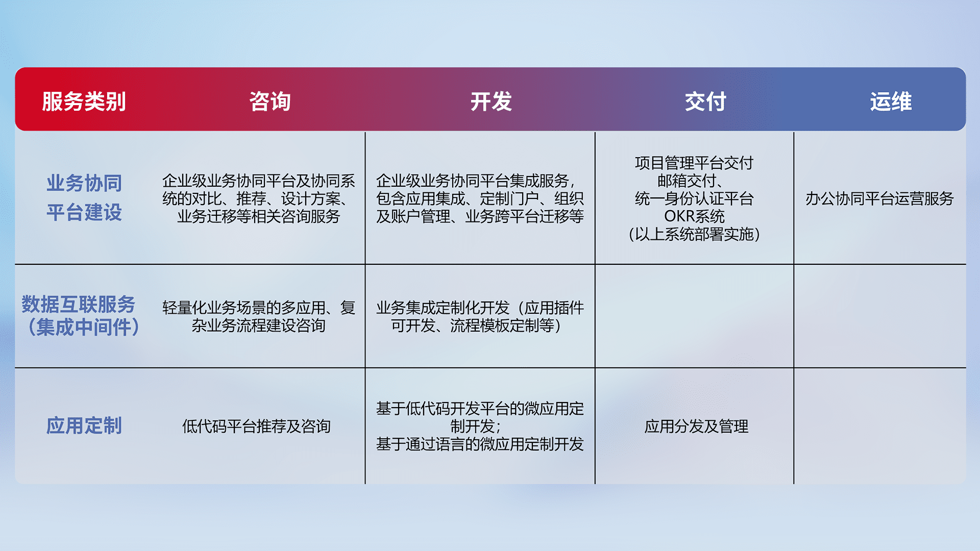 针对钉钉、、、企微、、、、IDaas等平台级产品提供产品的规划、、方案、、交付、、定制化开发等服务,,,实现如统一协同办公、、智能客户服务、、、、混合会议管理、、智能数据查询、、、等业务场景,,实现数字化转型。。。