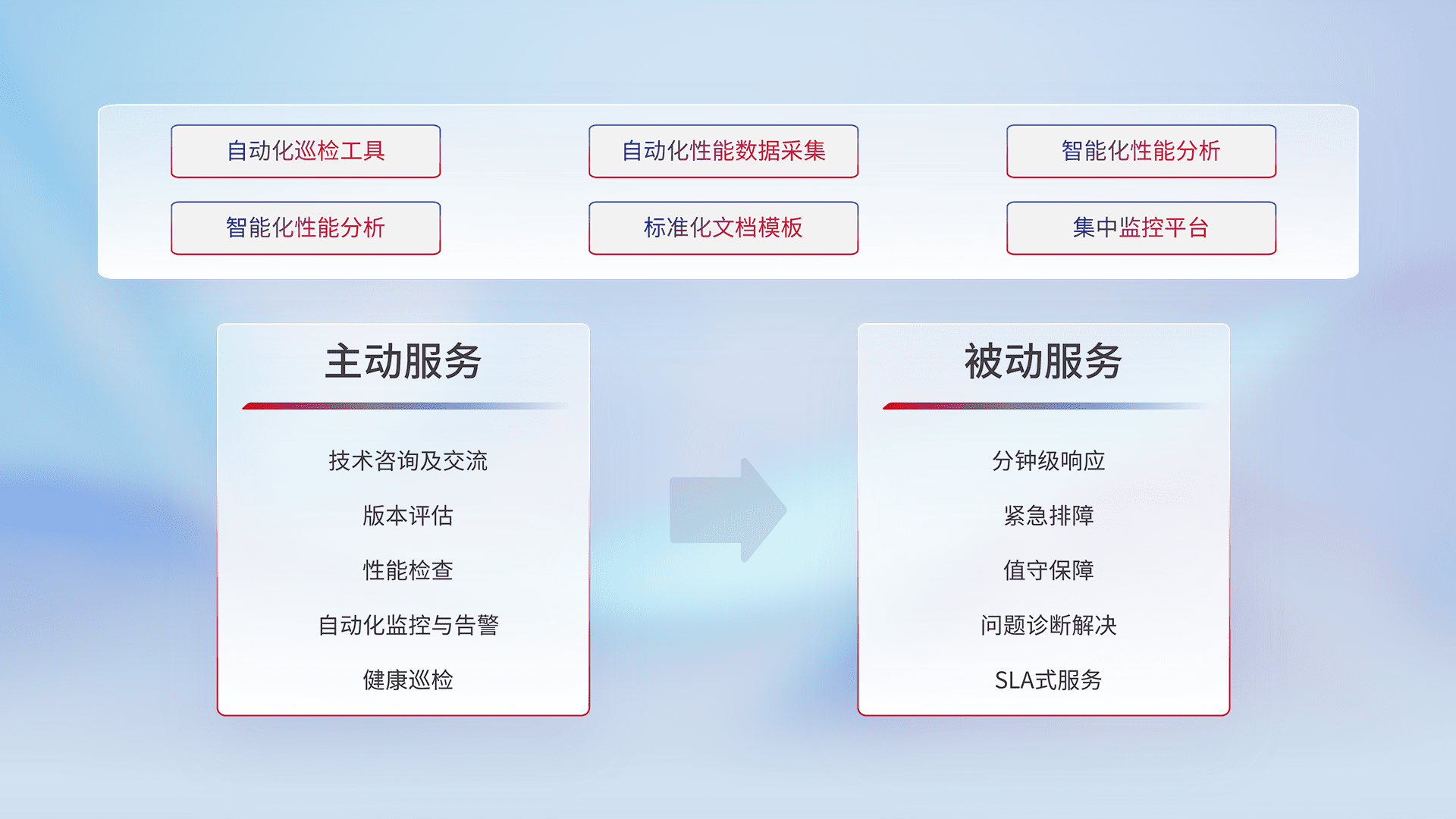 智能化工具和标准化文档,,,,保障服务质量,,,,提供主动服务(包含技术咨询、、版本评估、、、性能检查、、、、自动化监控与告警、、、、健康巡检)和被动服务包含(分钟级响应、、、、紧急排障、、、、值守保障、、问题诊断解决、、、、SLA服务)。。。。