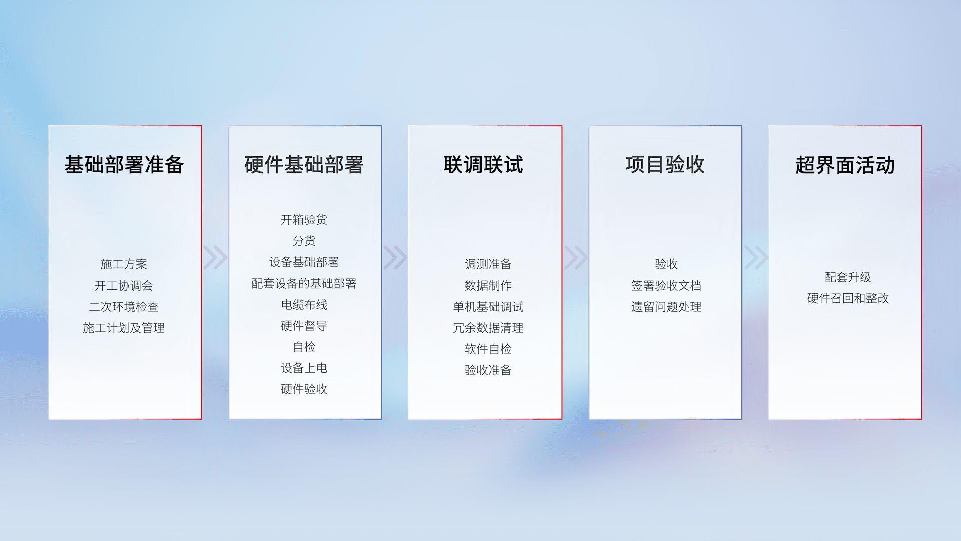 从基础部署准备、、、、硬件基础部署、、、、联调联试、、、、项目验收、、、越界面活动的全过程可追溯,,,保证施工质量和进度。。。。
